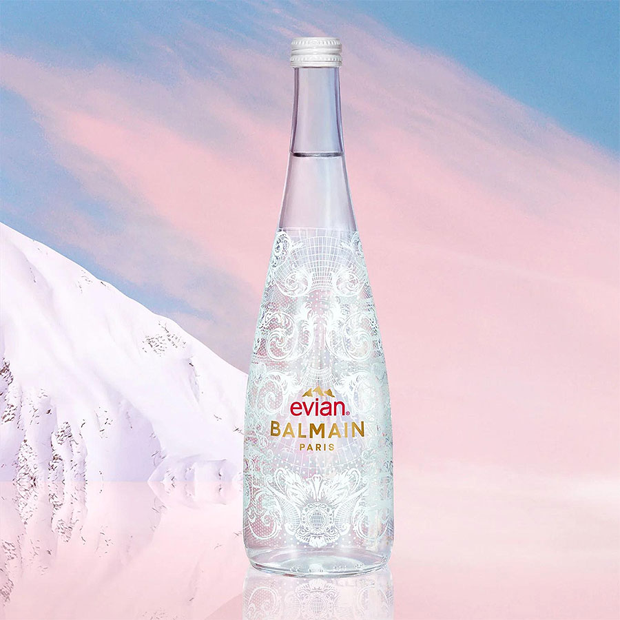 La première, fabriquée à partir d'un matériau contenant 46 % de bouteilles d'Evian en plastique recyclé, a fait sensation lors du défilé de mode printemps 2023 de Balmain, le 28 septembre, pendant la Fashion Week de Paris. La seconde, une bouteille en verre en édition limitée, sera lancée en octobre, ornée de lettres dorées audacieuses, de dentelle bleue, de motifs de gouttelettes et de touches baroques.