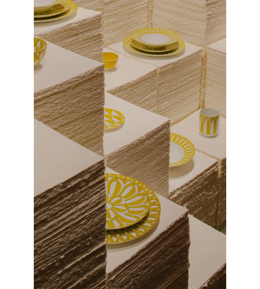 S’inspirant de la conception de châteaux d’eau, les quatre structures, à la fois légères et d’aspect brut, permettent de donner naissance à une mise en scène riche et poétique. Vous découvrirez au sein de ces écrins feutrés, la collection déclinée concernant le mobilier comme les assiettes de porcelaine aux symboles dorés.