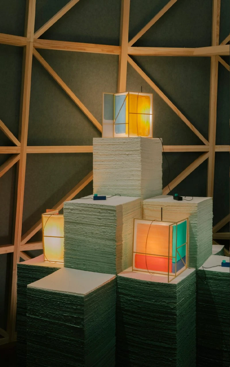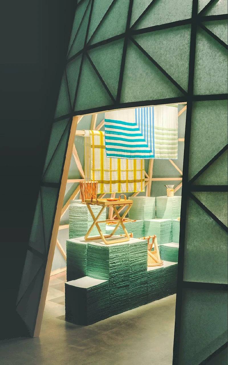 Une attention particulière est portée sur les matériaux qui se veulent réutilisables. Les structures en bois sont habillées de papiers translucides colorés, l’éclairage est au cœur de ces architectures et suggère une perception évolutive de la collection. Plus qu’une simple exposition, Hermès évoque l’histoire et le savoir-faire de chaque objet à travers le temps et l’espace.