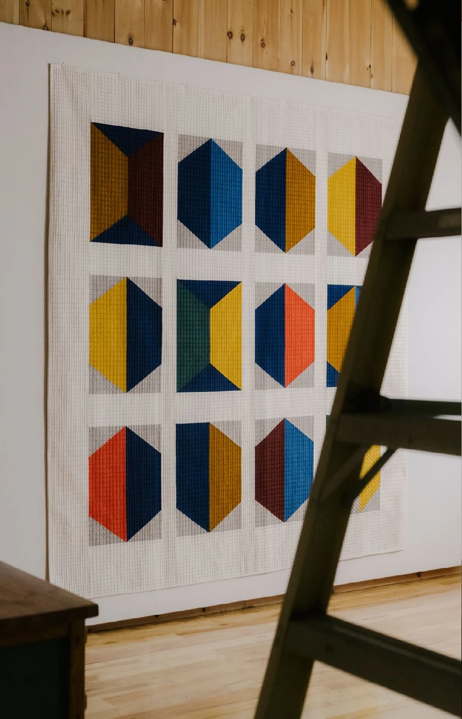 La géométrie des volumes et des imprimés rend compte de la recherche d’équilibre entre les matières et les couleurs.