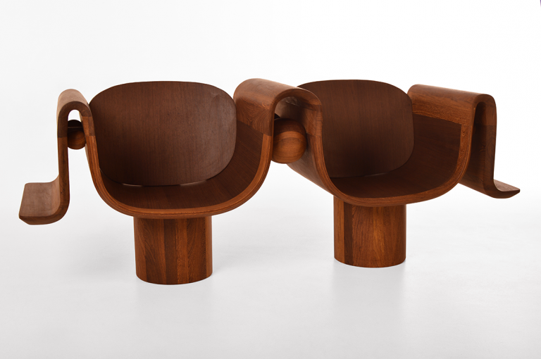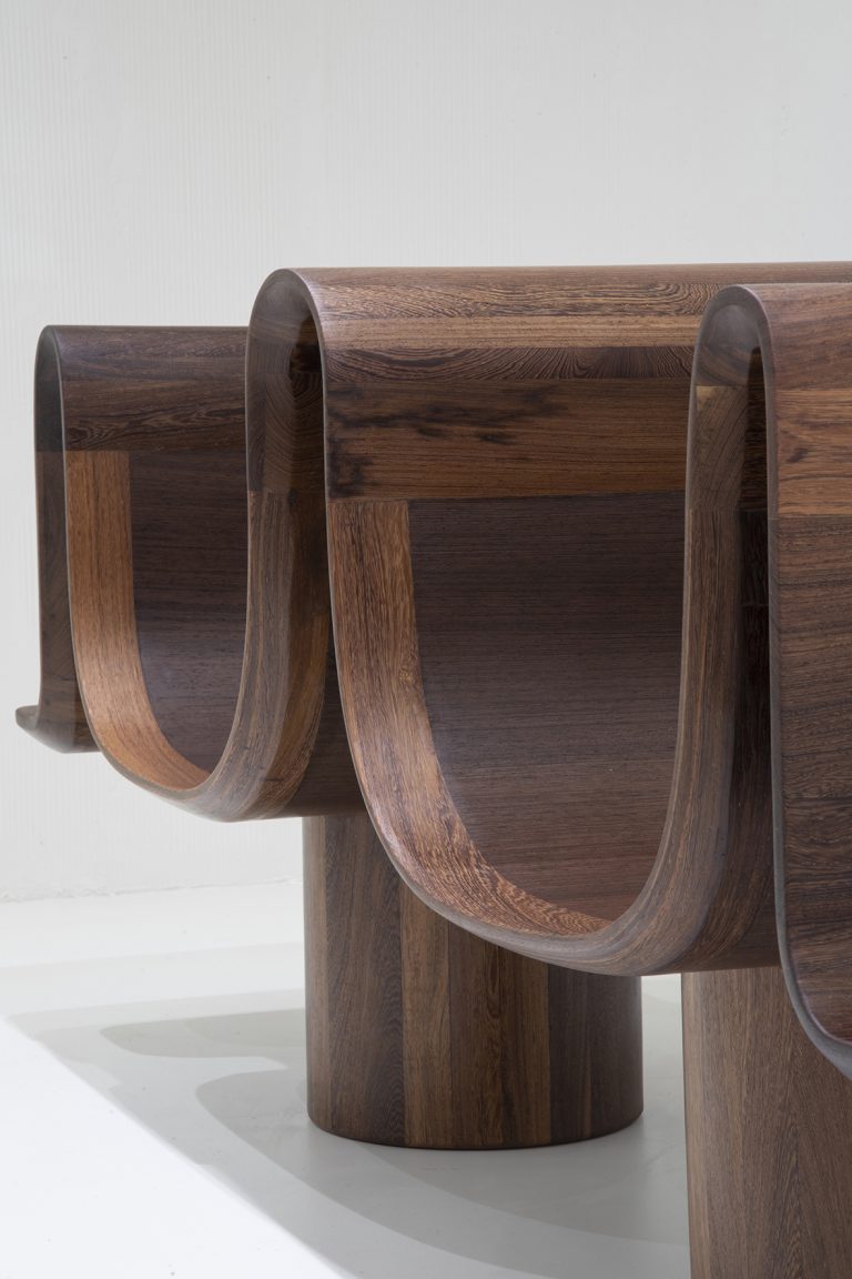 Le tabouret Efo avec le motif emblématique du double F met en évidence la fusion de deux matériaux : l’argile et le bois de panga panga. Les sculptures modulaires en bois et en terres sont entremêlées étroitement les unes dans les autres, tout en restant indépendantes. Autre bijou conçu par Delfina Delettrez Fendi pour la maison : la chaise Maduo, laissant paraître un morceau de serrure, ainsi que les compétences artisanales, le tout de manière subtile.