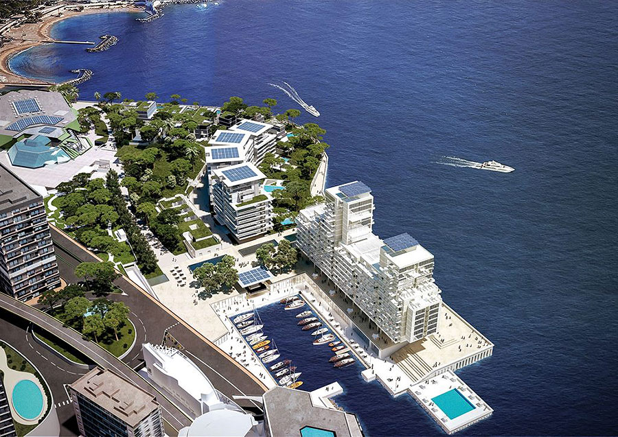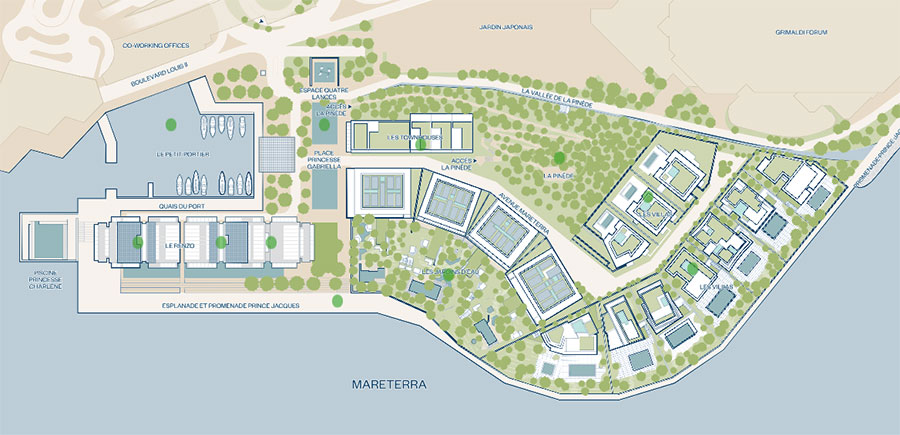 Au milieu d’une zone piétonne cohabitent un parc public, un petit port entouré de 3 000 m2 de commerces, une extension du Grimaldi Forum, un parking souterrain et une offre résidentielle.