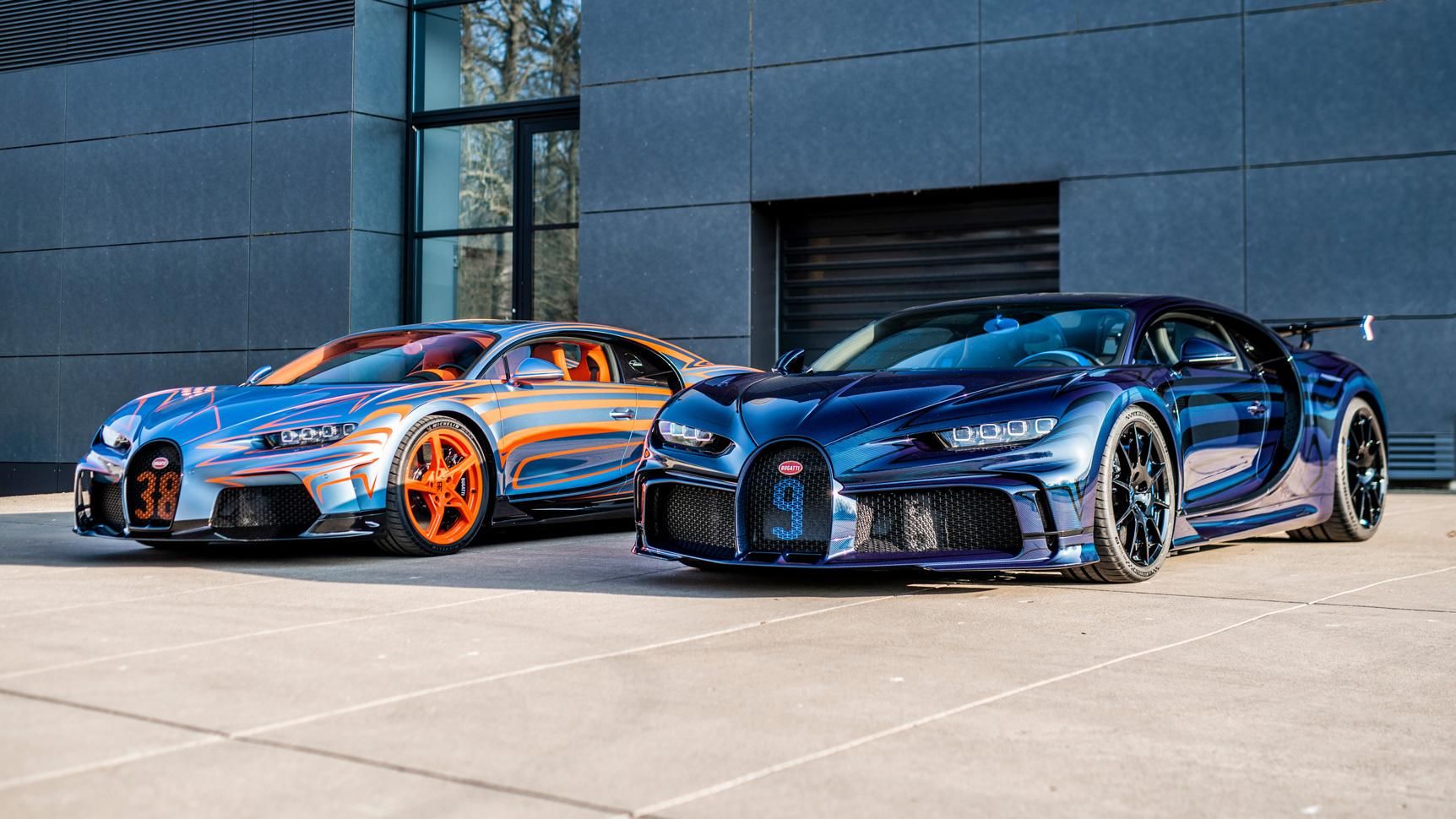 La première est une Chiron Super Sport de 1 587 ch dans une livrée bleu Californie avec des rayures orange - une ode aux lignes "inspirées de la lumière" de Bugatti. À la demande de son propriétaire, elle arbore le numéro 38 sur la calandre, avec une finition orange sur les roues et l'habitacle en cuir.