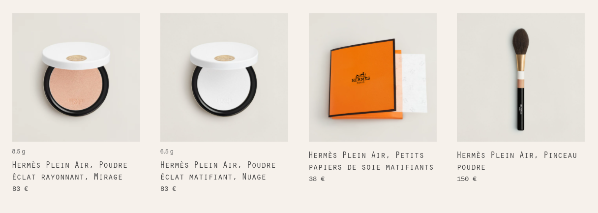 Pour le total “natural look”, Hermès nous présente quatre autres produits : la poudre éclat rayonnant, la poudre éclat matifiant, les petits papiers de soie matifiants et le pinceau poudre.