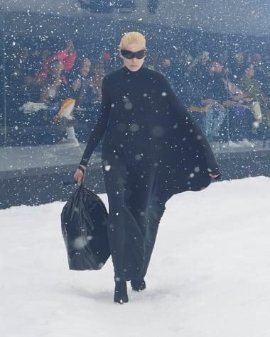 Le titre du spectacle - 360° - avait une double connotation : une référence à la fois à la chaleur et au lieu circulaire. Lorsque Demna s'est rendu dans les Alpes au début de l'année, il n'y avait pas de vraie neige dans les montagnes, seulement de la neige artificielle fabriquée par des machines. Cela l'a amené à penser à un avenir, pas si lointain, où la neige ne serait plus qu'un souvenir nostalgique, n'existant plus que sous la forme d'une simulation numérique ou d'un objet fabriqué à la machine pour quelques privilégiés.