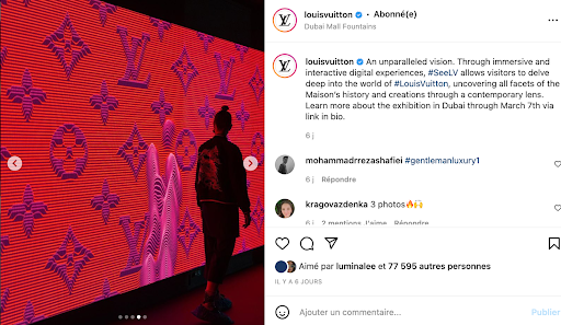 Elle dispose également d'un espace Instagrammable dans la dernière salle, pour tous les amateurs de photos et de réseaux sociaux. Un écran numérique interactif portant l’emblématique monogramme Louis Vuitton, qui reflète vos mouvements lorsque vous vous placez devant lui.