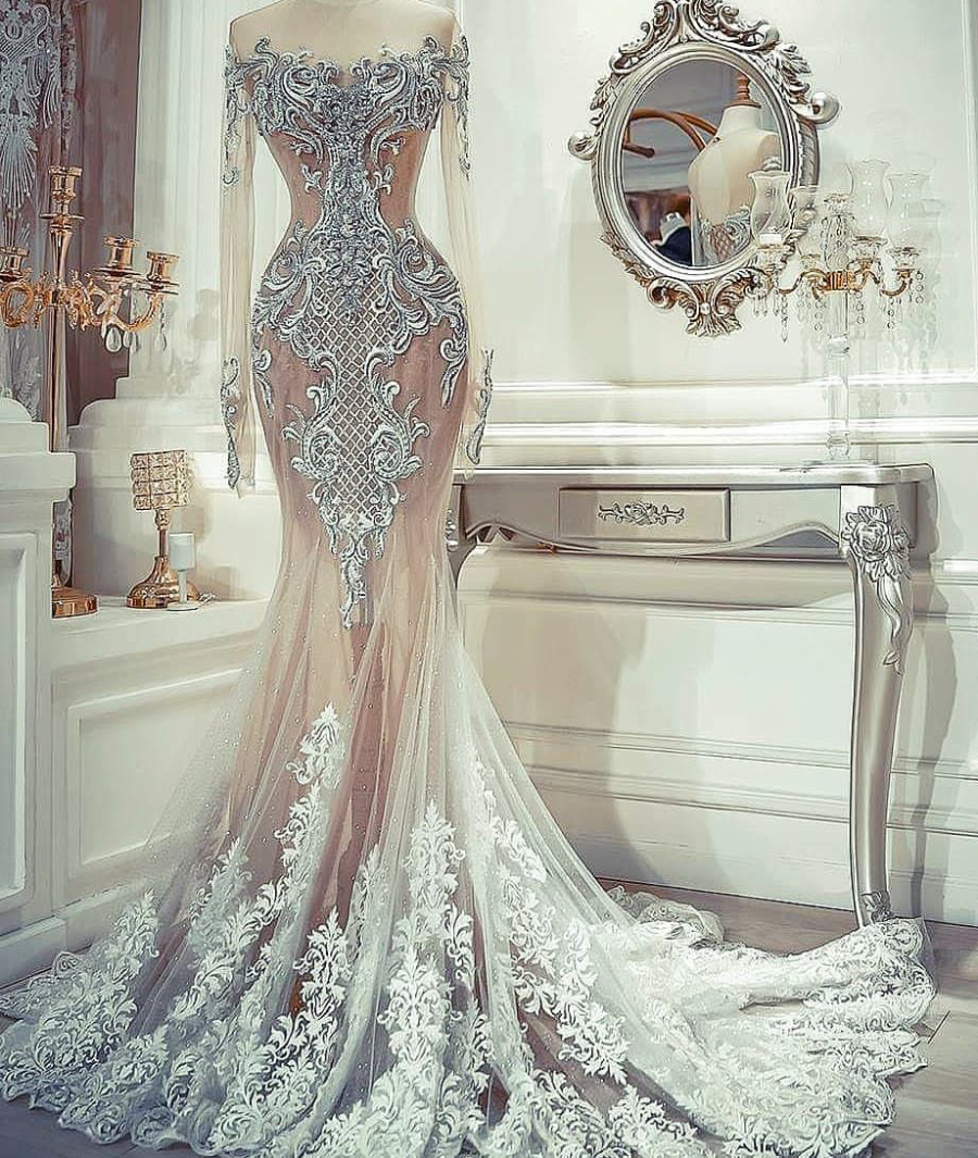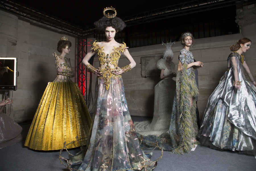 Le processus de création de cette pièce de luxe est un travail d’orfèvre. Des artisans hautement qualifiés, tels que des couturiers, des brodeurs et des plumassiers, consacrent des heures à réaliser des détails exquis. Des broderies à la main, des perles et des cristaux Swarovski sont minutieusement ajoutés pour créer un effet scintillant et spectaculaire.