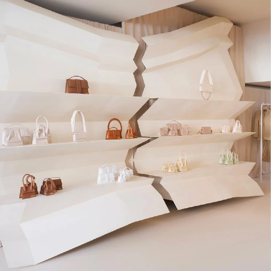 Afin d’attirer un maximum de clients, la décoration de la boutique éphémère change tous les 5 mois environ. La première décoration, lors de l’ouverture du magasin, était centrée sur le thème de la "cérémonie". Simon Porte Jacquemus s’est aussi inspiré de ce thème pour créer sa célèbre collection "Le Papier" en utilisant des couleurs neutre tel que le beige, l’ocre, le marron et le blanc.