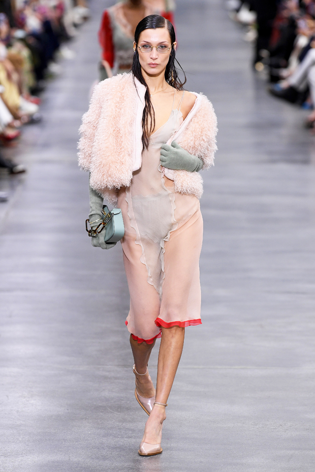 La collection qui en résulte est amusante et séduisante. Les robes, les chemisiers et les jupes en mousseline de soie transparente, ainsi que la palette de couleurs pastel (vert menthe et rose pâle) illustrent la légèreté de la collection. Cet état d'esprit s'est également traduit dans les sacs. Conçus par Silvia Venturini Fendi, les nouveaux accessoires Fendi ont été réalisés dans des matières pelucheuses comme le cachemire et le vison intarsia pour s'accorder à la douceur de leurs couleurs.