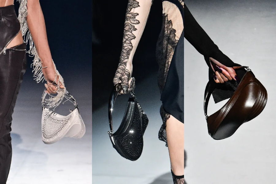 Apparaissant au bras des personnalités au premier rang, comme à celui des mannequins sur le podium, le premier sac de la maison Mugler imaginé par Casey Cadwallader attirait tous les regards. Un micro-sac aux lignes acérées et à la forme dynamique.