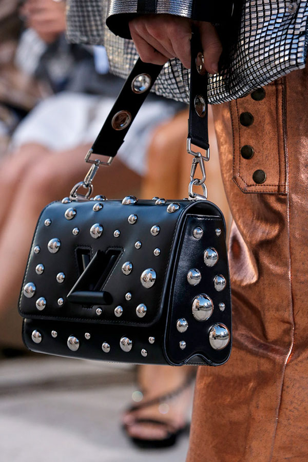 L’un des sacs en cuir noir de Louis Vuitton est orné de boules argentées rappelant Narcissus Garden, l’une des oeuvres les plus connues de Yayoi Kusama.