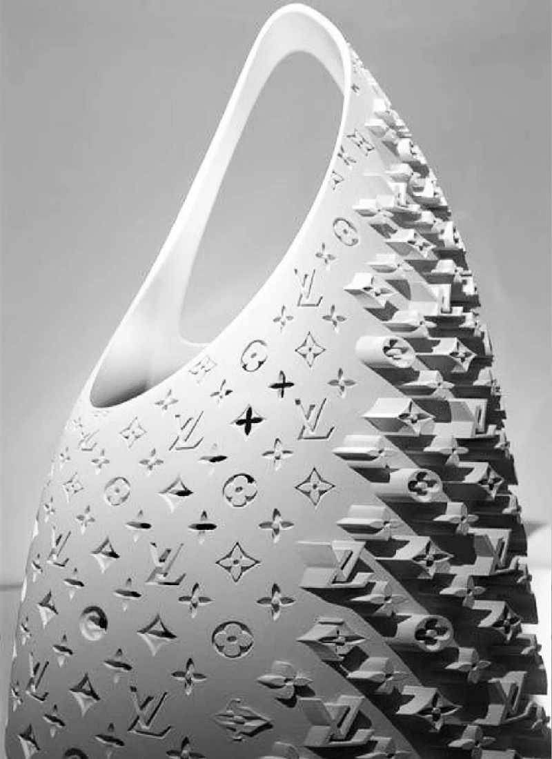 Ce sac de forme courbée, arbore un logo creusé à mi-chemin entre l’architecture et la mode. Cette création suscite l’engouement.