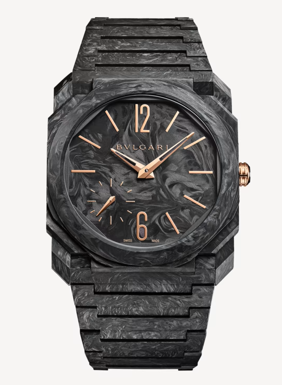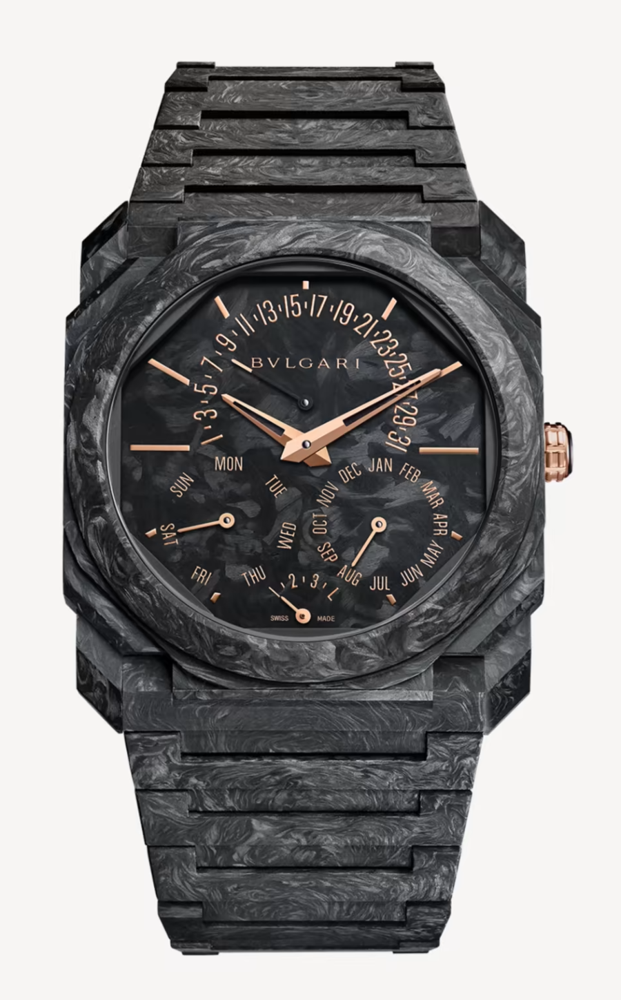 Une icône aux multiples records de l'horlogerie moderne, l'Octo Finissimo de Bulgari ne cesse d'évoluer avec de toutes nouvelles versions « Automatique » et « Calendrier Perpétuel » en carbone, rehaussées de touches d'or rose.
