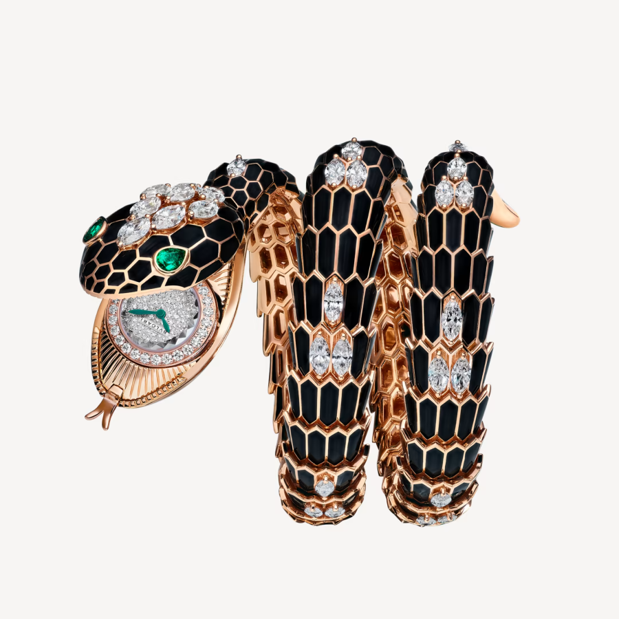 Animée par le micro-calibre Piccolissimo développé en interne, l’un des plus petits mouvements mécaniques jamais créés, la montre de Haute Joaillerie Serpenti Misteriosi en or rose 18 K allie savoir-faire d’exception, maîtrise des éléments décoratifs et expertise horlogère suisse. S'enroulant autour du poignet avec une sinuosité particulière, ce chef-d'œuvre envoûtant est rehaussé de laque noire, de diamants taille navette étincelants et d'yeux en émeraude fascinants, dans une interprétation saisissante de l'icône intemporelle Bulgari, le serpent.