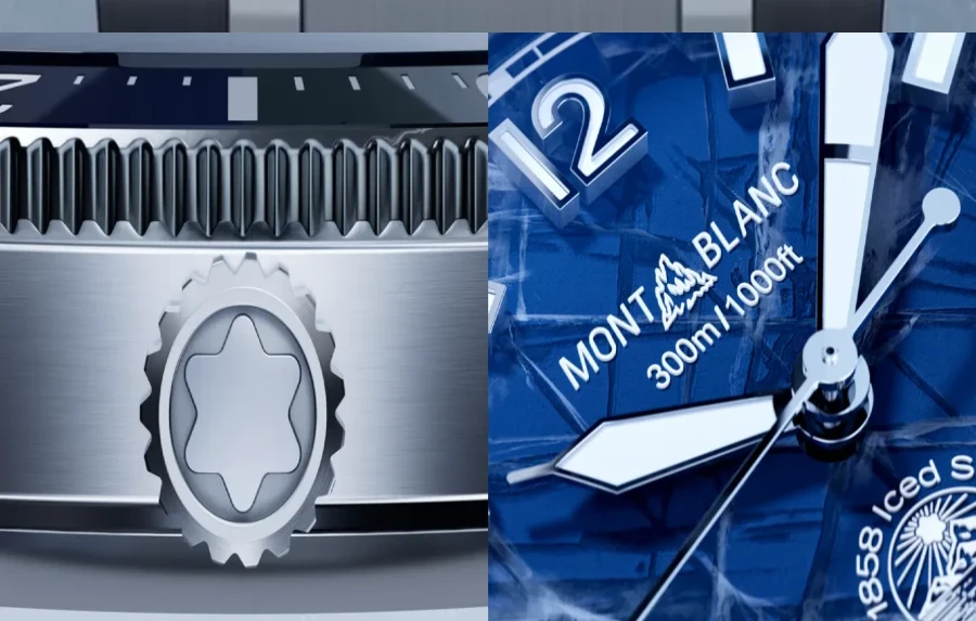 La Montblanc 1858 Iced Sea Automatic Date, toute première montre de plongée Montblanc, présente un cadran rehaussé d’un motif glacier donnant l’impression d’en voir les profondeurs