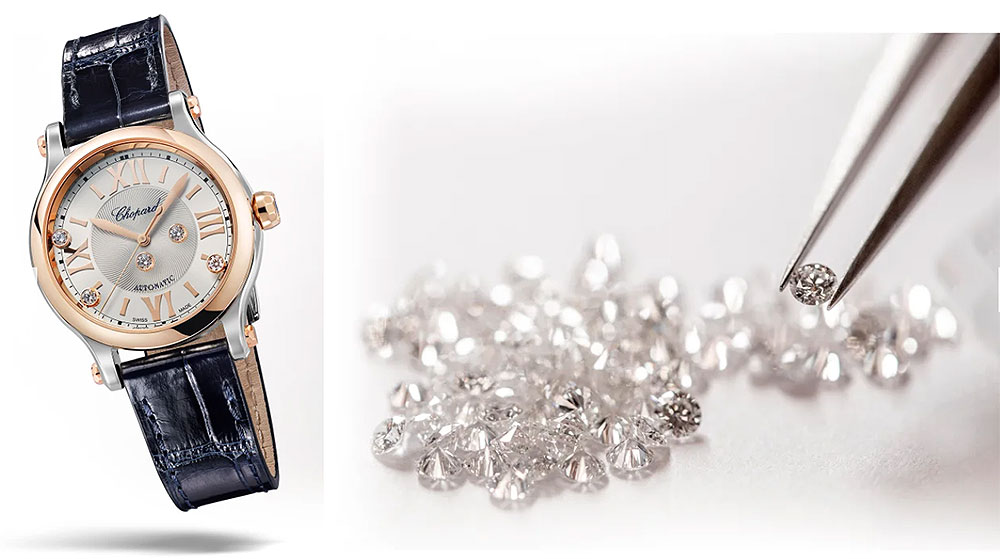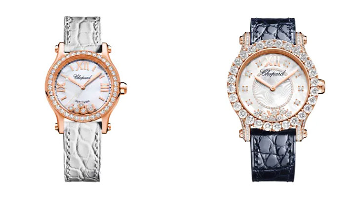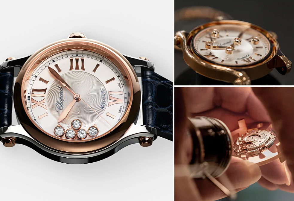 Toujours à la recherche d’harmonie, Chopard offre à son icône une taille plus petite. Partant du nombre d’or, mis en relation directe avec le diamètre du mouvement automatique Chopard 09.01-C qui anime les collections de montres de luxe pour femme, le boîtier de la montre en diamant Happy Sport a été redessiné dans une taille de 33 mm de diamètre particulièrement adaptée au poignet féminin.