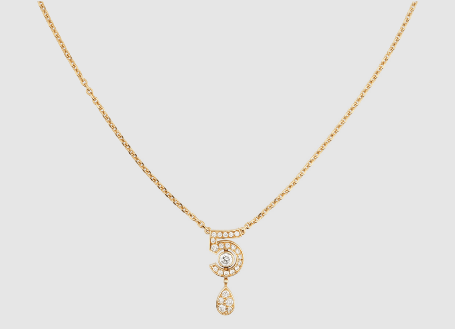 Un bijou en OR BEIGE et diamants qui dévoile une goutte de parfum et inspiré du chiffre fétiche de Mademoiselle.