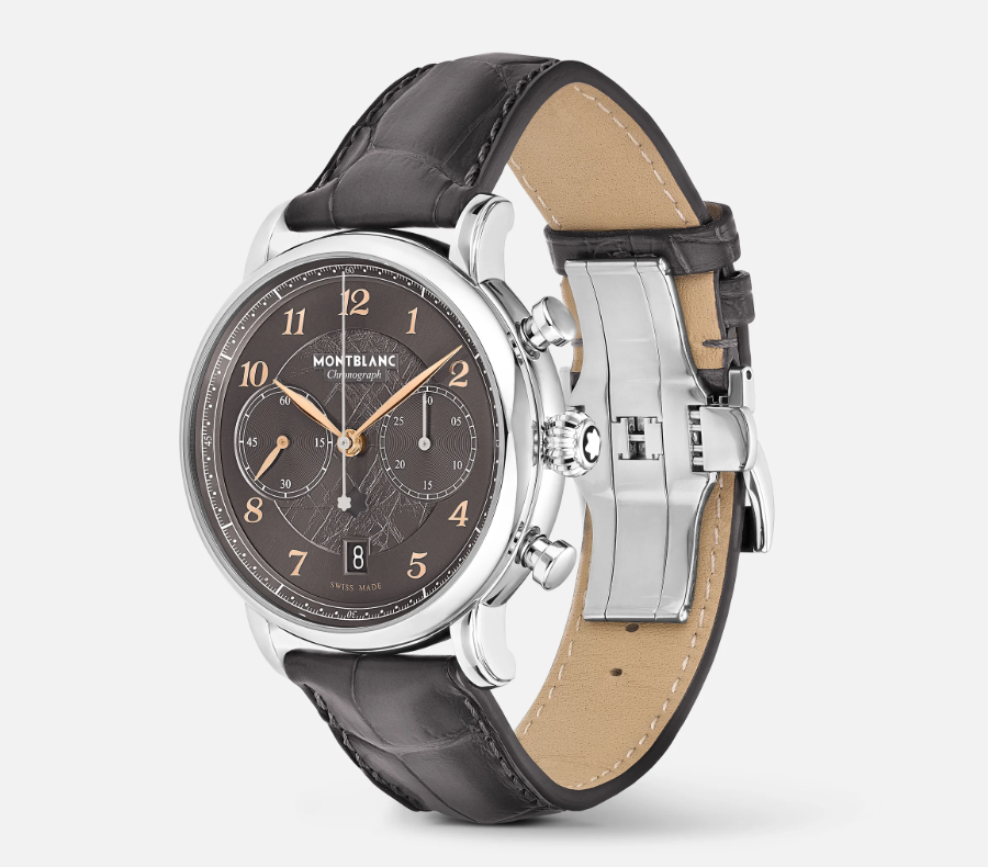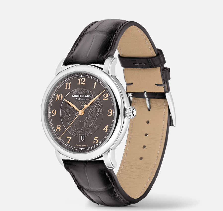 Les chiffres arabes et les aiguilles plaqués or rose sont apposés sur le cadran à motif gris glacier. L’emblème Montblanc sur l’aiguille des secondes s’unit une fois par minute à son double situé au-dessus du guichet de la date juste au moment vertical haut.