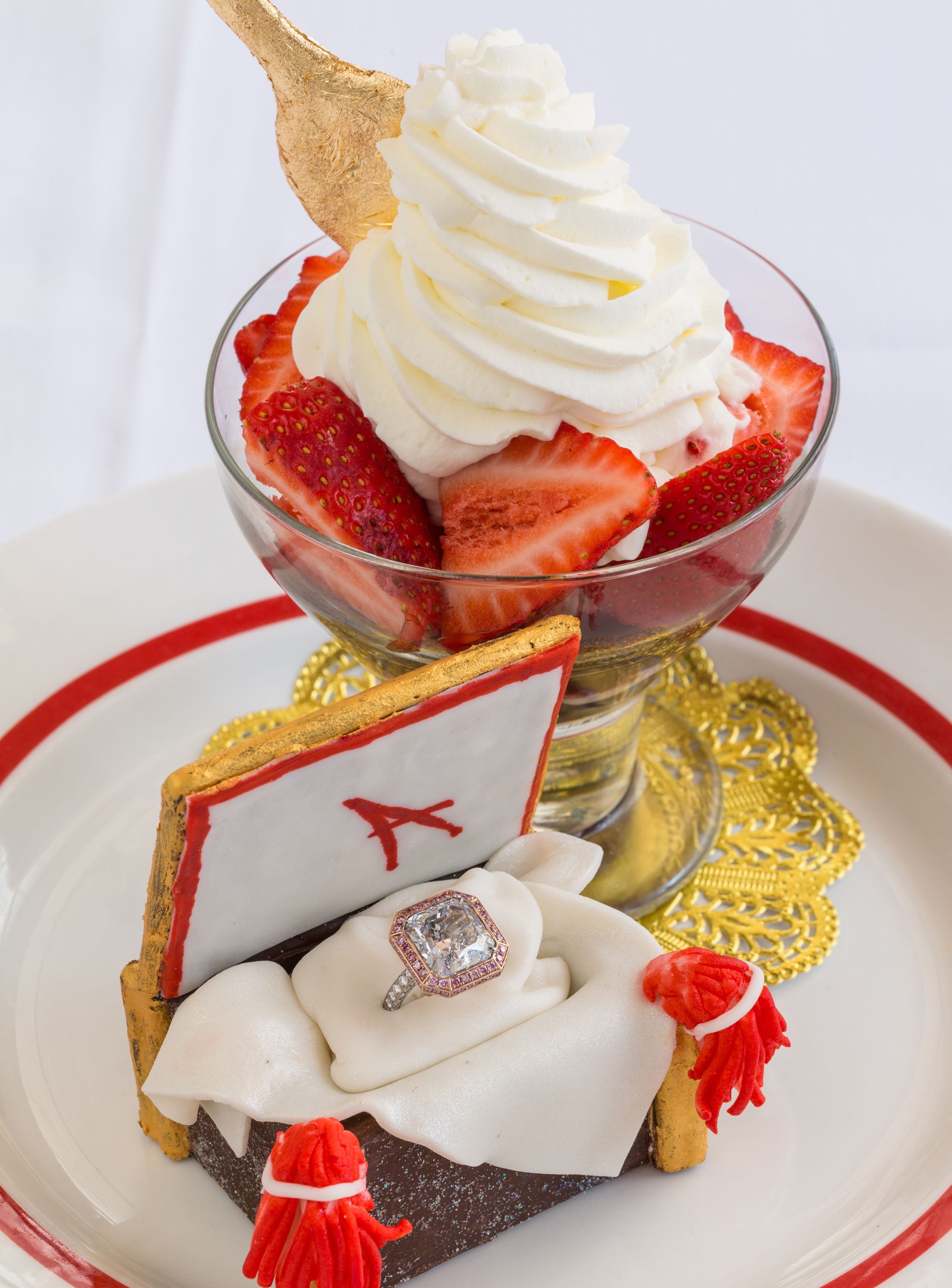 Les luxueuses fraises améliorées par la maison sont accompagnées de cannelle de Ceylan, vanille venant tout droit de Tahiti, le tout enrobé d'une rare sauce au porto rubis. Une panoplie de liqueurs d'ultra luxe accompagnent le dessert et des feuilles d'or comestibles 24 carats le subliment.