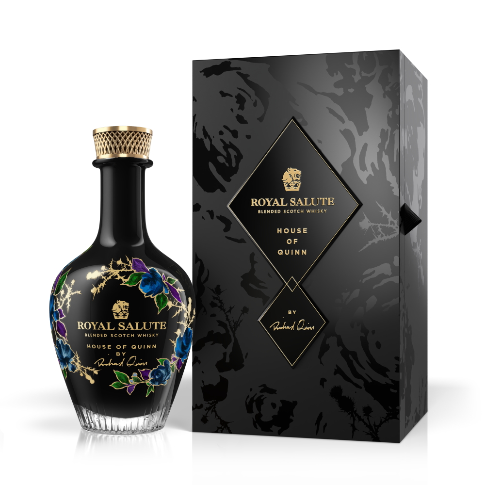 Après la sortie de l'édition Richard Quinn 21 years de la Royal Salute Couture Collection en septembre dernier -qui présentait des flagelles blanches et noires avec des motifs floraux bleus- voici la House of Quinn by Richard Quinn. Limitée à seulement 200 carafes soufflées à la bouche, numérotées individuellement, en cristal noir Darlington et finies à la feuille d'or, son prix de vente recommandé a été fixé à 12 000 dollars soit 10 000 euros.