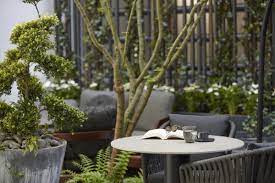 Au cœur de l’hôtel, se cache une agréable terrasse ombragée qui propose une parenthèse hors du temps où l’on se prélasse à l’abri des regards. Entre érables japonais, fougères rafraichissantes et mobilier aux coloris naturels et chaleureux, le patio invite à la détente loin du tumulte de la capitale et devient le lieu idéal pour une pause savoureuse.
