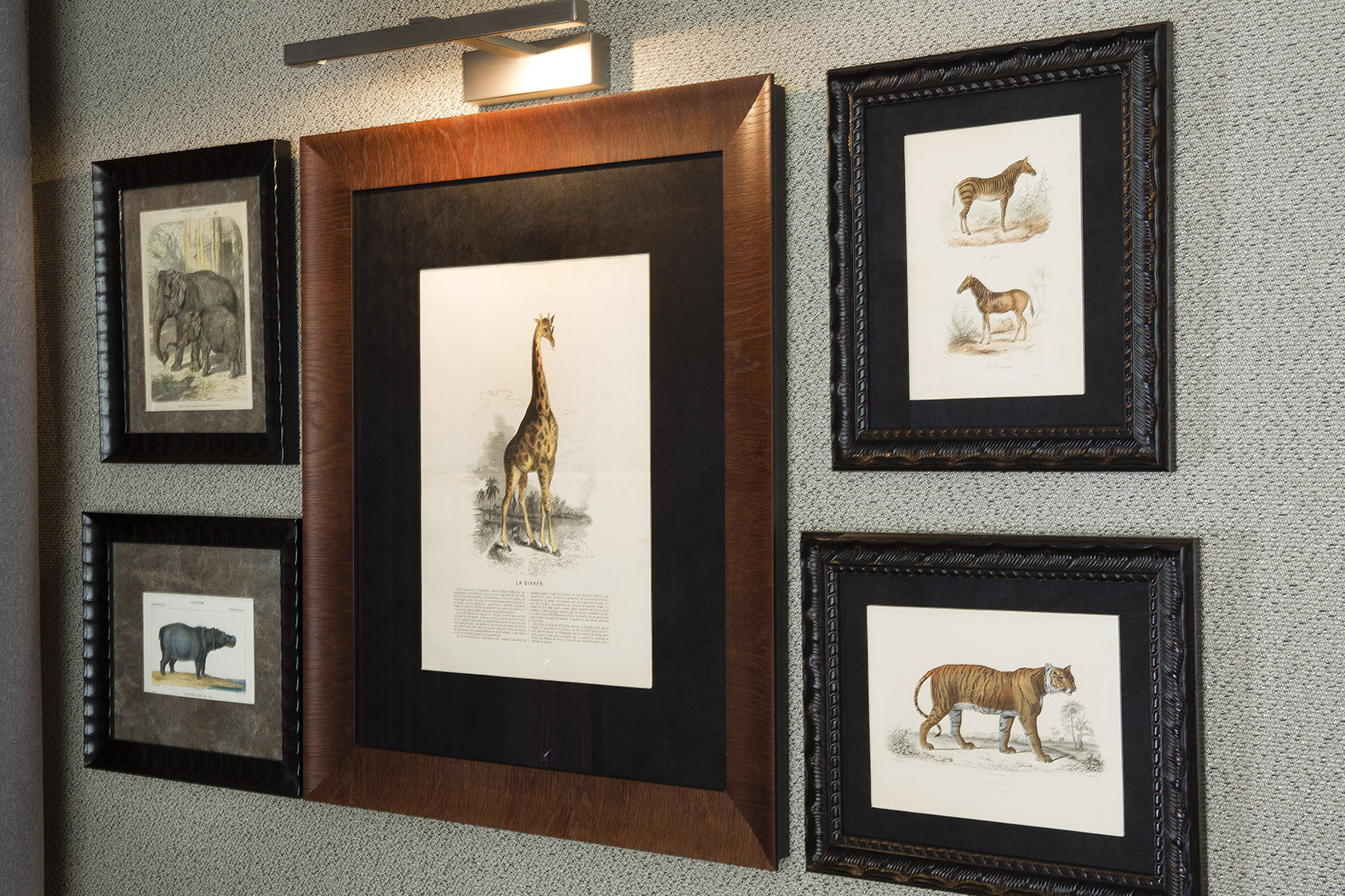 Pour l’hôtel Monge, les décorateurs Marie-Agnès Louboutin et Patrice Henry ont imaginé une atmosphère cosy inspirée par la faune et la flore à travers de subtils détails distillés au gré des étages. La réception s’apparente volontiers à un cabinet de curiosités, ambiance retour de voyage, toujours dans un esprit nature, où terrarium et bocaux en tous genres côtoient livres anciens, objets chinés et œuvres d’art. Les tons bruns et tabac font la part belle aux bois anciens et aux velours façon club de gentlemen anglais. Tandis que le salon très raffiné, plus féminin, invite à une pause cocooning dans l’une des bergères installées devant la belle cheminée ancienne. La décoration fait appel à quelques grands classiques parisiens dont les lourds rideaux de flanelle signés Pierre Frey ou les tapisseries et cadres de chez Deyrolle.