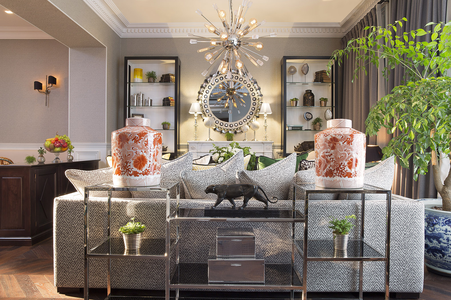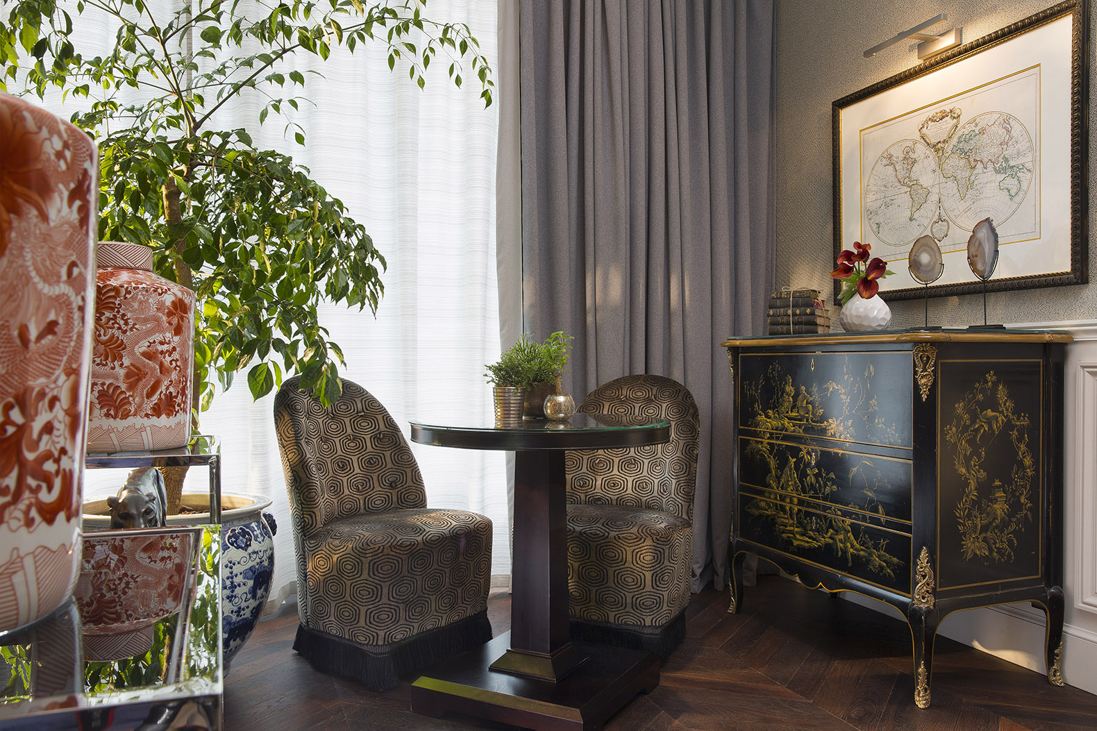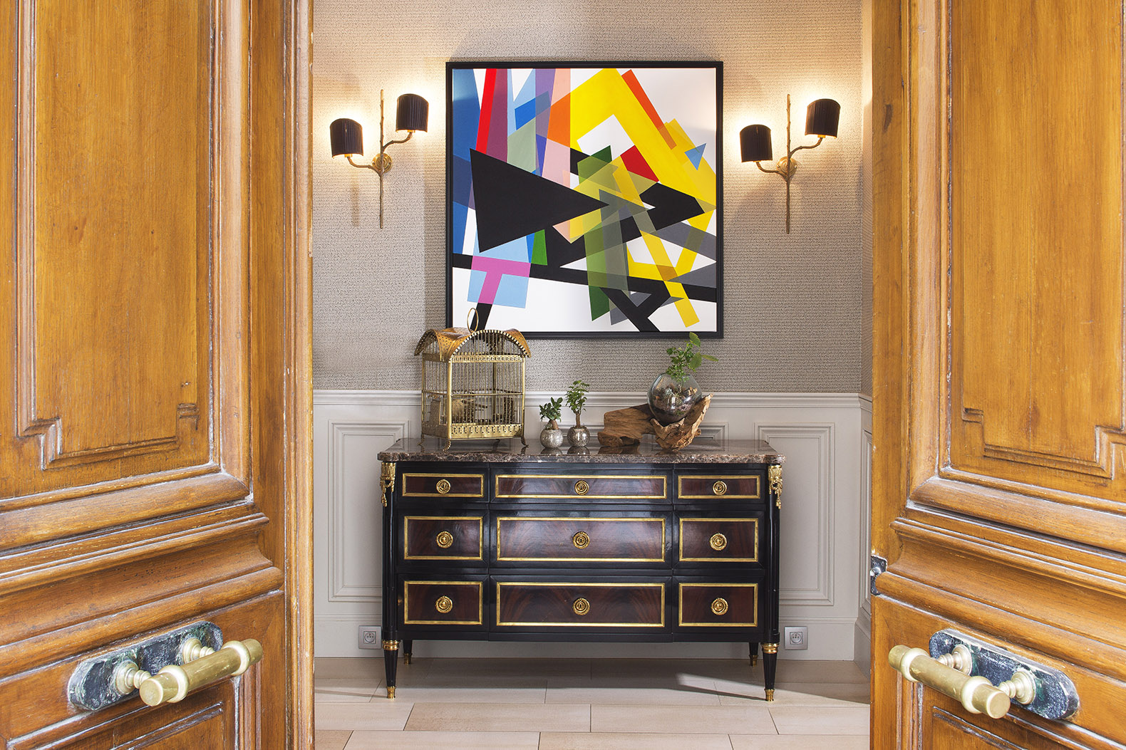 On retrouve dans le salon-lobby les codes incontournables des grandes maisons parisiennes du 19ème siècle avec quelques belles pièces de mobilier. Comme cette magnifique commode Louis XVI en acajou et bois de ronce de la Maison Tallardat ou le secrétaire signé Moissonnier. Et en contraste, quelques tableaux et œuvres contemporaines et ce très original miroir fabriqué sur-mesure pour l’hôtel.