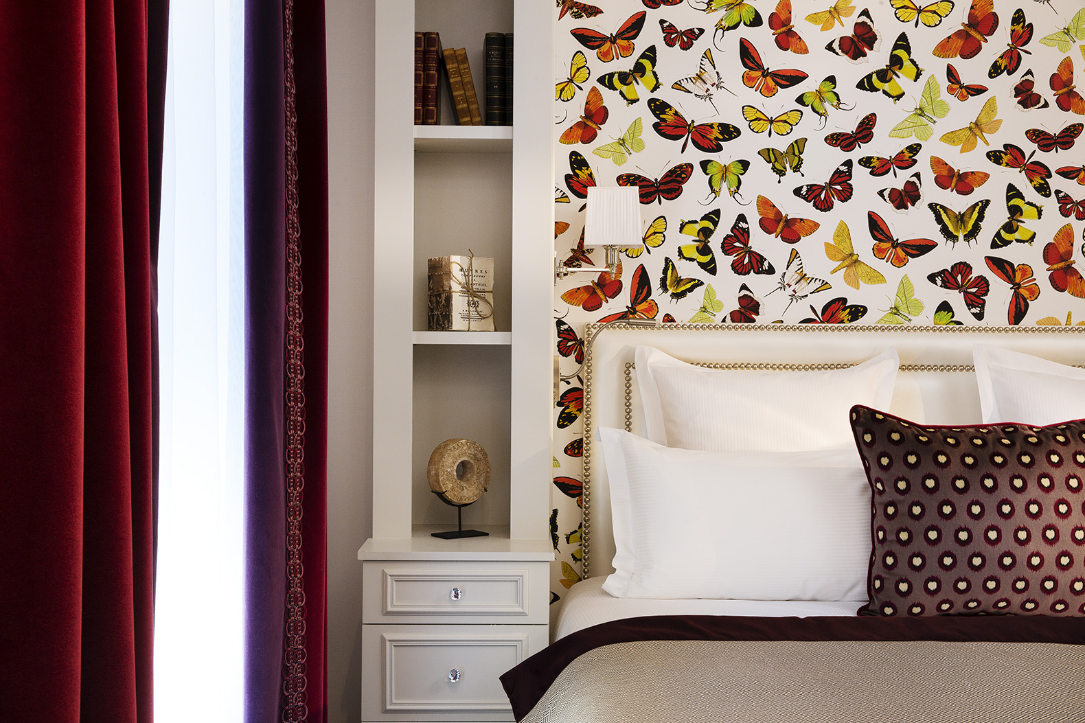 Les 30 chambres, colorées et lumineuses, offrent de belles vues sur les toits de Paris ou les arènes. Les papiers peints chatoyants de la maison Deyrolle aux motifs de papillons ou de perroquets égayent les têtes de lit et l’on retrouve sur le mobilier des objets qui pourraient s’entendre comme autant de souvenirs de voyage.