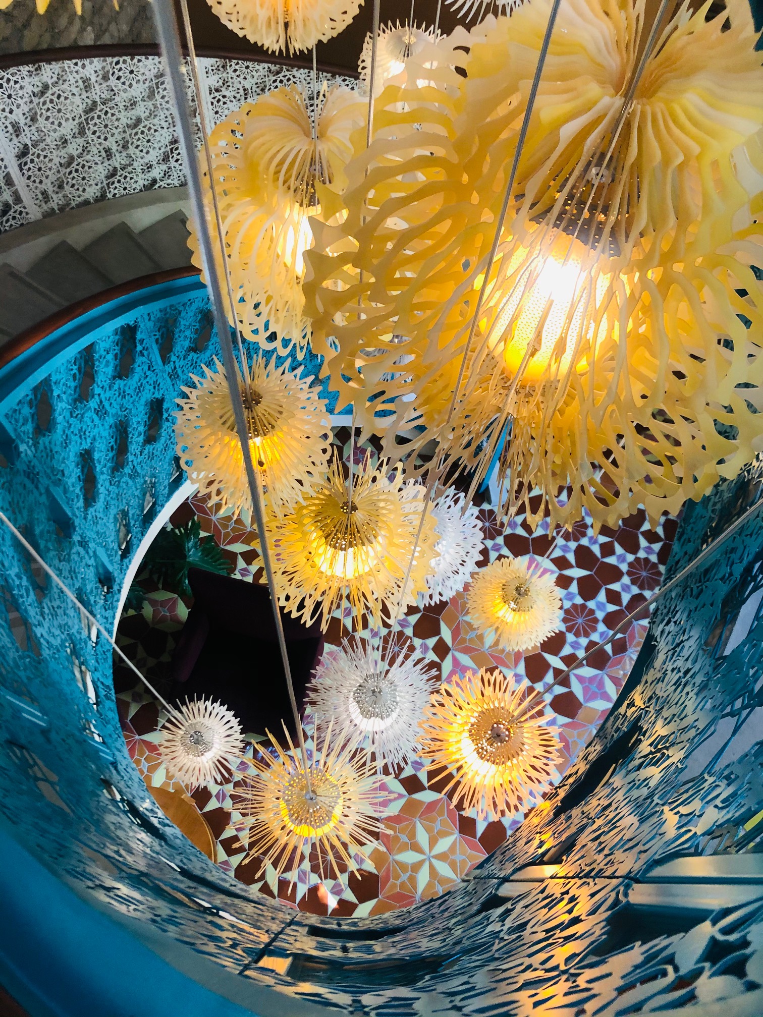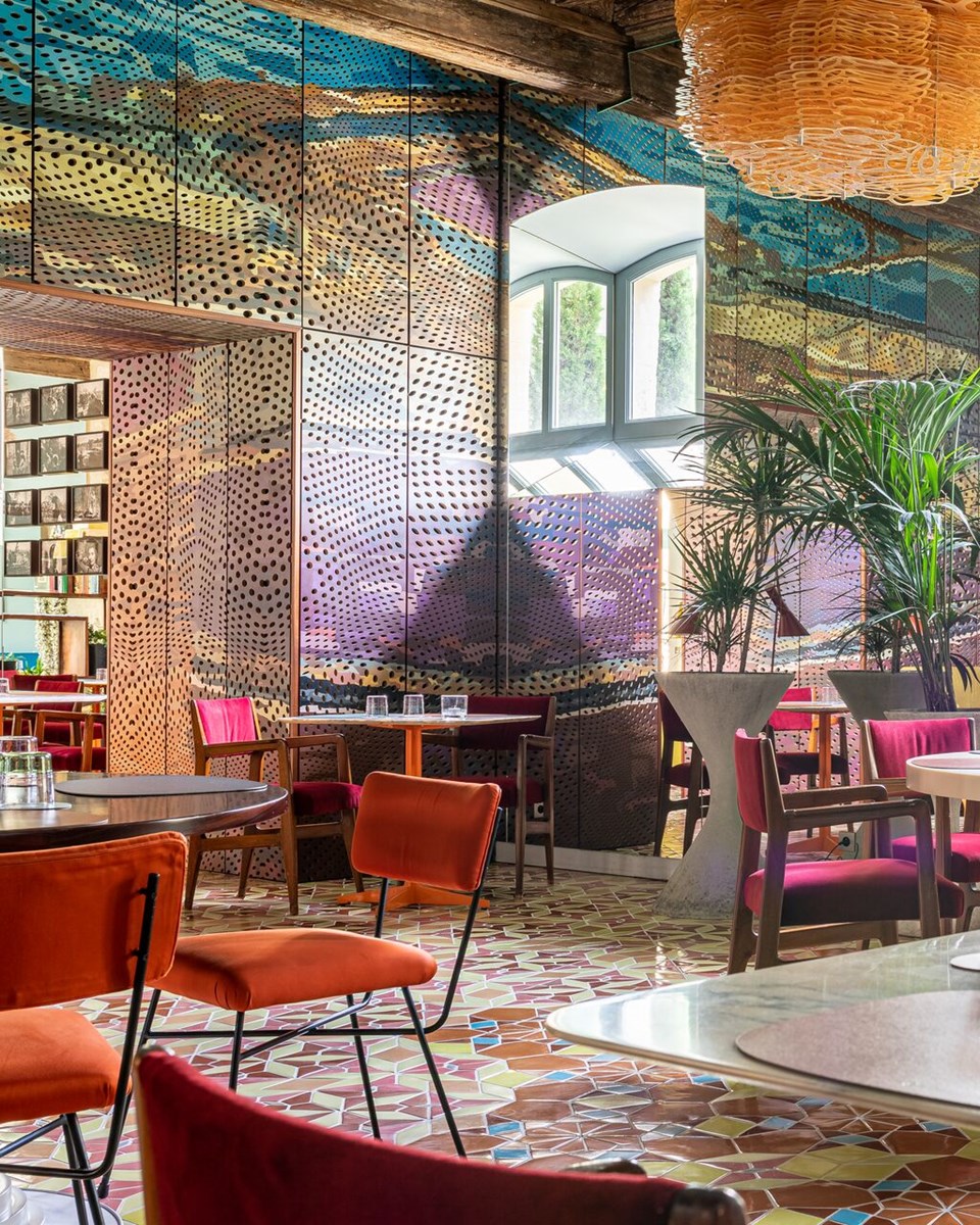 En pièce maîtresse, cette superbe mosaïque qui recouvre quelque 6000 m2 dans tout l’hôtel, déclinant 11 formes et 18 couleurs. Fabriquée au Mexique dans une ancienne usine qu’il a fallu réouvrir pour l’occasion tant la commande était importante, elle a été soigneusement posée par une entreprise arlésienne.