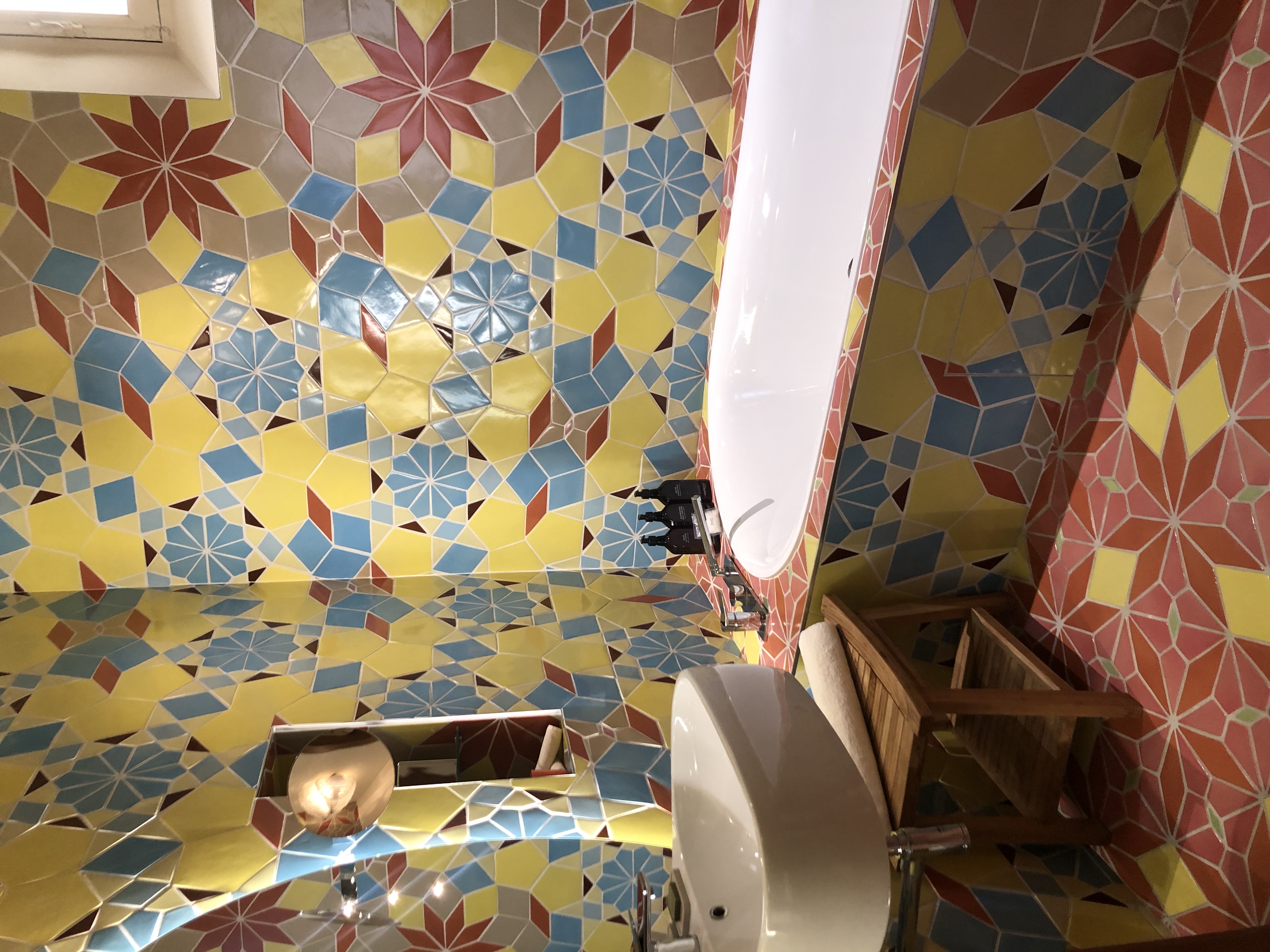 La salle de bains constitue l’une des réussites de la chambre, elle s’entend comme une pièce aux couleurs lumineuses et chatoyantes où l’on s’attarde volontiers. La mosaïque y habille les murs avec splendeur du sol au plafond.