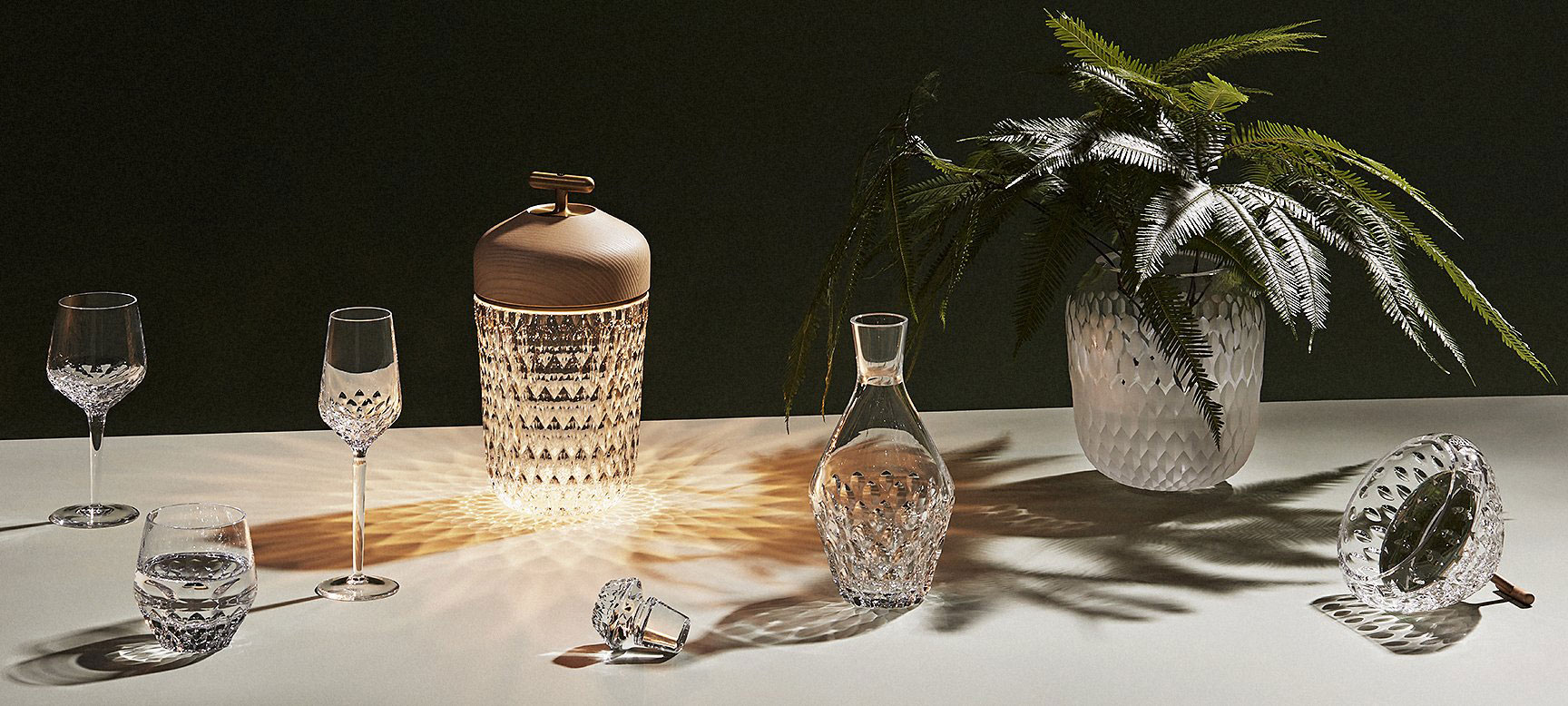 Toutes les pièces de cette collection font écho à la forêt qui entoure l’usine Saint-Louis. C’est dans ce contexte et environnement que le designer Noé Duchaufour-Lawrance a trouvé l’inspiration l’ayant poussé à allier l’éclat délicat du cristal à la force brute du bois de frêne.